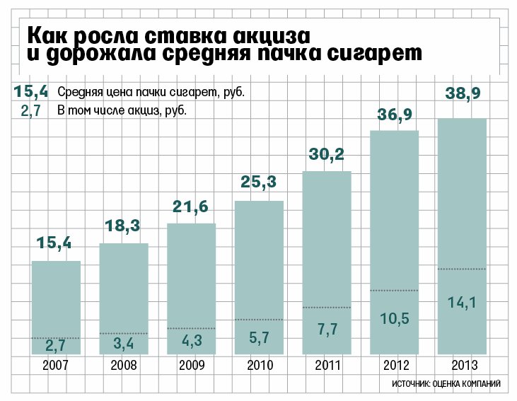 В этом году средняя пачка сигарет стоит 38,9 руб., из которых 14,1 руб. составляет акциз. К 2015 г., по подсчетам директора по корпоративным отношениям «БАТ России» Александра Лютого, только за счет увеличения акцизов и НДС средняя цена вырастет до 54 руб. за пачку. Повышение акциза в течение последних трех лет уже критично, указывает он: рост акцизов способствует развитию нелегальной торговли сигаретами из стран Таможенного союза, где средняя розничная цена сигарет ниже на 30%.