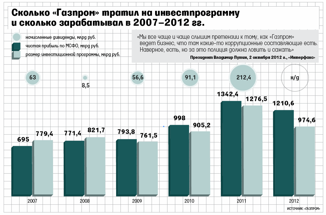 «Газпром» давно упрекают в неэффективности, несмотря на то что компания в последние годы бьет рекорды по инвестициям, напоминает аналитик Raiffeisenbank Андрей Полищук (см. инфографику). А снизить затраты госкорпораций на 10% поручал Дмитрий Медведев в мае 2011 г., еще когда был президентом. Впрочем, в 2012–2013 гг. «Газпром» пошел на сокращение инвестпрограммы. В декабре 2012 г. концерн одобрил инвестпрограмму на 2013 г. – 705,4 млрд руб.