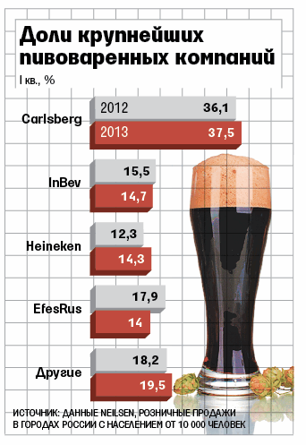 По данным Nielsen, на Carlsberg, InBev, Heineken и Efes Rus приходится 81,4% розничных продаж.