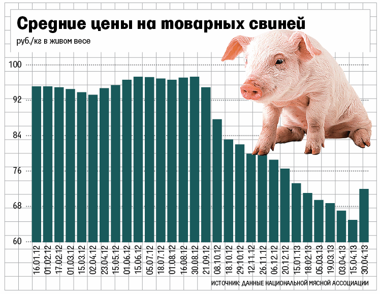 Цены на свиней выросли впервые с августа прошлого года. После присоединения России к ВТО снизился уровень тарифной защиты рынка свинины (внутри квоты импортные пошлины были снижены с 15 до 0%, а вне квоты – с 75 до 65%), поэтому резко вырос импорт более дешевой свинины из Европы. К августу прошлого года цены, составлявшие 90 руб. за 1 кг, поползли вниз (см. график). А себестоимость производства в России, напротив, пошла вверх из-за роста цен на корма после прошлогодней засухи. В результате к концу 2012 г. свиноводы заговорили о приближающейся катастрофе на рынке: современные производители работали на грани рентабельности, а некоторые даже в убыток.