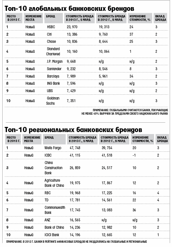 Самый дорогой бренд среди глобальных банков, HSBC, подорожал на 24% – в частности, в результате экспансии на латиноамериканском и азиатском рынках, где он занял ведущие позиции. Его рекламный слоган, который можно видеть в аэропортах и на телеканалах во многих странах мира, – The world's leading local bank («Ведущий местный банк мира») – уже не первый год имеет громкий успех.