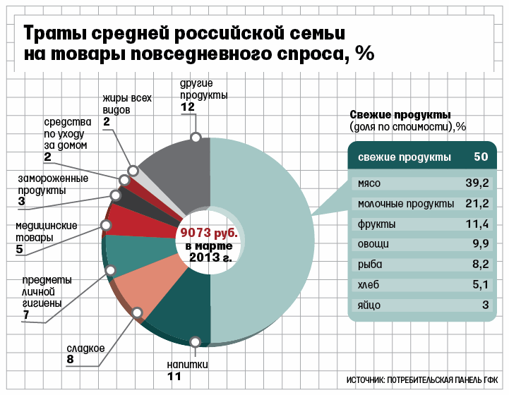 Среднестатистическая российская семья ежегодно тратит на товары повседневного спроса (FMCG) 108 800 руб., или примерно 9000 руб. в месяц, подсчитала исследовательская компания GfK Rus по собственной потребительской панели. Траты в натуральном выражении год от года растут незначительно, траты на продукты питания увеличиваются в основном за счет роста цен, а увеличение потребления и числа премиальных покупок играет весьма незначительную роль, рассказал автор исследования, заместитель гендиректора GfK Rus Сергей Яшко на форуме Института Адама Смита «Агробизнес в России». За прошлый год, по данным GfK, продажи продовольственных товаров увеличились на 8,7%, из которых 6 процентных пунктов дал рост цен, в том числе 5,1% – продовольственная инфляция и 0,9% – смещение спроса в сторону премиум-сегмента.