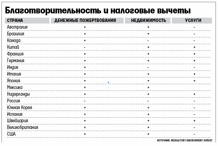 Везде, за исключением России, благотворительные пожертвования дают право компаниям-донорам на налоговые вычеты. В некоторых странах льготы можно получить также за выделение помещений благотворительным организациям и за оказание им услуг (см. таблицу).