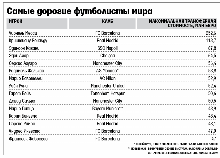 Стоимость футболистов подсчитала швейцарская компания CIES Observatory, которая специализируется на спортивной и, в частности, футбольной аналитике. Самый дорогой футболист в мире, по ее оценке, – нападающий FC Barcelona и сборной Аргентины Лионель Месси: его трансферную стоимость CIES Observatory оценила в 217,4–252,6 млн евро. На втором месте коллега Месси по чемпионату Испании, форвард Real Madrid и сборной Португалии Криштиану Роналду: он оценен в 102,2–118,7 млн евро. Тройку самых дорогих игроков замкнул нападающий итальянского SSC Napoli и сборной Уругвая Эдинсон Кавани: его трансферная стоимость – 58,3–67,8 млн евро (подробнее см. таблицу).