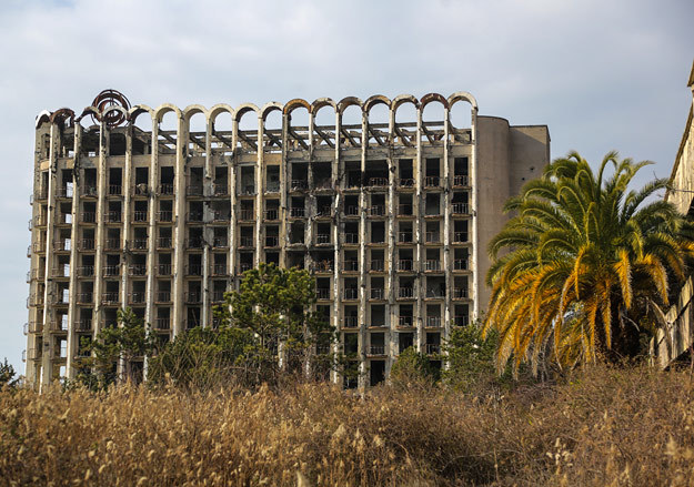 Мы оказались на пустынном берегу. Вокруг простирались заросли ежевичника, скрывавшие то, что когда-то было газонами и кортами. Над морем высился огромный дом, похожий на каменный баян. Это была заброшенная спортивная база «Эшера», где когда-то тренировались лучшие советские спортсмены перед Олимпиадой-80. Здание было покрыто следами от снарядов, местами почернело от пожаров. «Тут проходила линия фронта», - объяснил Роман.