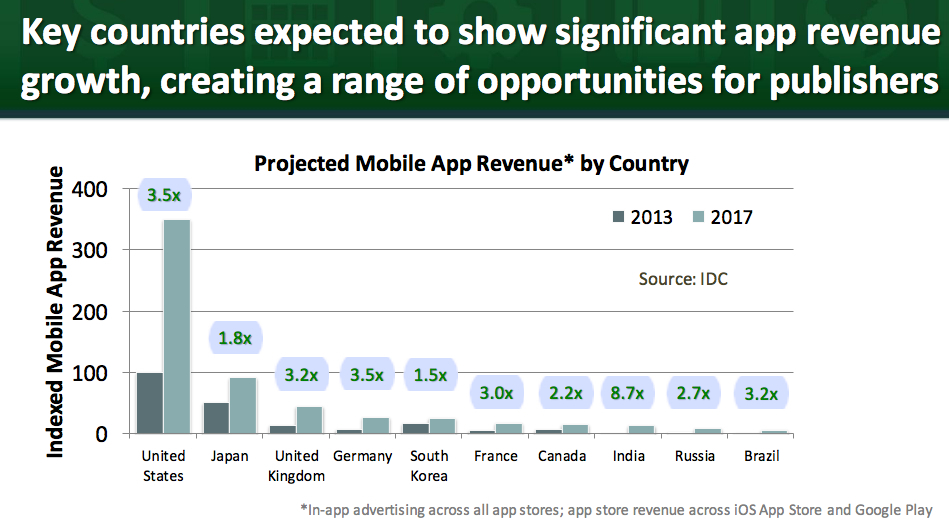 Самый быстрорастущий рынок рекламы в мобильных приложениях - США: с 2013 по 2017 г. он вырастет в 3,5 раза, прогнозируют App Annie и IDC. Самый заметный рост ожидается в этот период в Индии - в 8,7 раза. Драйвером роста индийского рынка станет все большее проникновение смартфонов в этой стране. По данным IDC, количество смартфонов и планшетов на iOS и Android в мире выросло с 2012 по 2013 г. в 1,7 раза, а выручка от продаж приложений и рекламы в расчете на одно устройство увеличилась в 1,1 раза за тот же период.