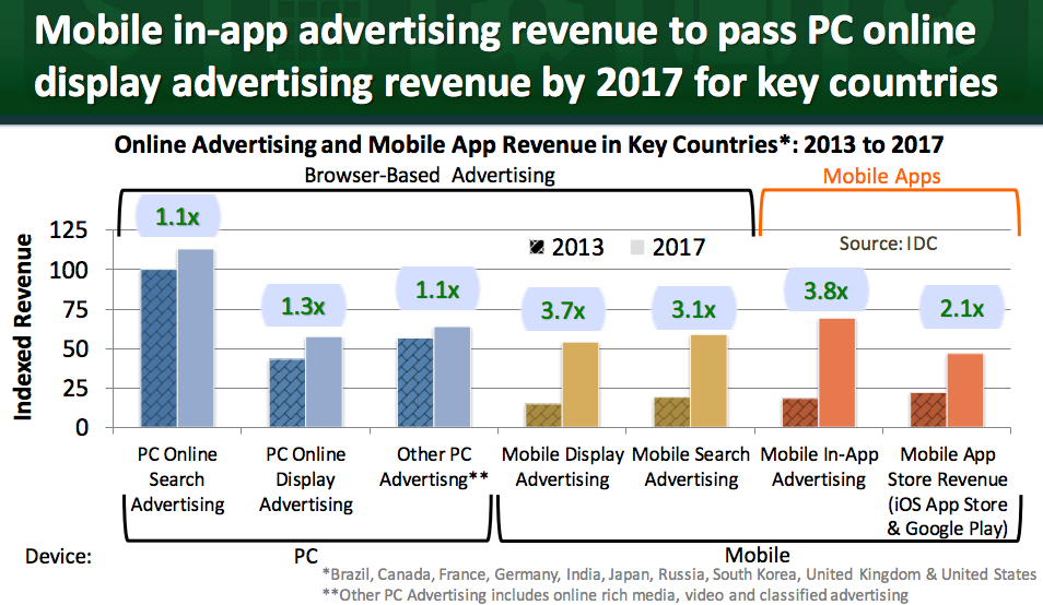 В 2013 г. выручка магазинов мобильных приложений Apple AppStore и Google Play выросла на 130%, а доходы от продажи рекламы внутри приложений - на 60%. По темпам роста этот рынок уже обогнал рынок медийной рекламы в мобильных браузерах и браузерах на ПК: этот рынок вырос в 2013 г. на 50 и 10% соответственно.