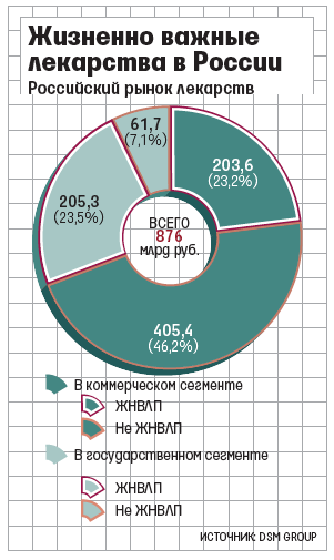 На ЖНВЛП, по данным DSM Group, приходится 34,3% коммерческого сегмента фармацевтического рынка (т. е. продажи лекарств в аптеках, его оборот в 2013 г. - 609 млрд руб.). Цены на такие лекарства с 1 апреля 2010 г. регулирует государство: Минздрав по согласованию с Федеральной службой по тарифам (ФСТ) регистрирует предельные отпускные цены производителя, регионы устанавливают оптовые и розничные надбавки. Российские производители могут раз в год повысить цену на прогнозируемый уровень инфляции текущего года, у иностранных возможности перерегистрации цен нет.