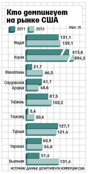 Двадцать пятого февраля 2014 г. минторг США по заявлению US Steel, «дочки» ТМК - IPSCO и Tenaris начал расследование в отношении импортеров сварных нефтесервисных труб на американский рынок. Тогда ведомство опубликовало данные о том, что в демпинге подозреваются трубные компании из Кореи - Hyundai Hysco и Nexteel Co., Ltd, а также компании из Индии, с Филиппин, из Саудовской Аравии, с Тайваня, из Таиланда, Турции, с Украины и из Вьетнама (см. график). В пятницу министерство объявило размер предполагаемых антидемпинговых пошлин. Для корейских компаний она может составить 9,89-15,75%, самая высокая предусмотрена для вьетнамской WSP Pipe Co. - 118,32%.
