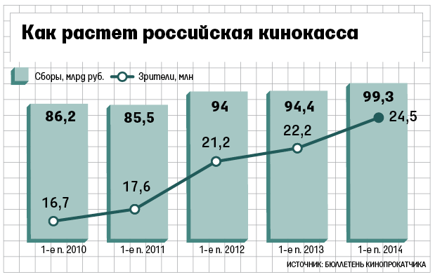 Пока год складывается для российских фильмов удачно - их сборы выросли в 1,5 раза до 5,8 млрд руб., подсчитал журнал «Бюллетень кинопрокатчика». Это 24% всей национальной кассы. Для сравнения: в первой половине прошлого года на отечественные картины приходилось 17,7% кассы. Число российских картин в прокате также выросло - с 27 до 43. Сборы отечественных фильмов растут быстрее, чем весь рынок, который вырос на 10,2% до 24,45 млрд руб. Схожие данные у исследовательской компании Movie Research, которая оценила российскую долю в прокате за полугодие в 23,7%.