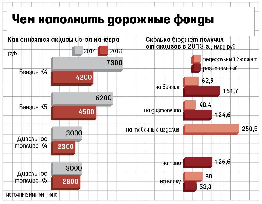 Минфин ищет, чем заполнить дыру в дорожных фондах, которая возникнет из-за налогового маневра. Профинансировать дороги могут нефтяные компании, производители алкоголя или сигаретВ 2015 г. правительство собиралось повысить пошлины на экспорт мазута до 100% от нефтяной, получив от отрасли более 355 млрд руб. Но из-за сопротивления нефтяников было решено выбрать более мягкий для них вариант в виде налогового маневра (рост НДПИ и компенсирующее снижение пошлин). По последнему сценарию, пока согласованному на уровне Минфина и Минэнерго, бюджет недополучит 198,3 млрд руб.