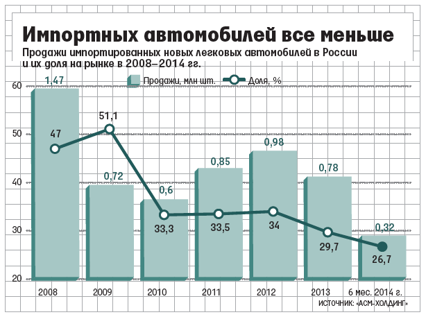 Производство легковых автомобилей в России в 2014 г. снизится на 3% до 1,9 млн шт., а рынок - на 8-12% до 2,3-2,4 млн шт., прогнозирует PricewaterhouseCoopers (PwC). Экспорт может сохраниться или сократиться, а удержать производство главным образом поможет снижение импорта благодаря развитию локализации, говорит старший менеджер автомобильной практики PwC Сергей Литвиненко. С ним соглашается аналитик «ВТБ капитала» Владимир Беспалов. «АСМ-холдинг» прогнозирует, что производство легковых автомобилей снизится на 1% до 1,9 млн шт. (1,4 млн шт. составят иномарки). Президент «АвтоВАЗа» Бу Андерссон ранее прогнозировал падение рынка на 10-20%, Renault - на 10%, Ассоциация европейского бизнеса - на 12%.
