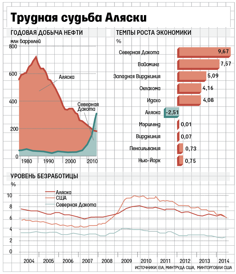 В будущее Аляски нефтяные компании вложили миллиарды долларов, в том числе в строительство трубопровода в условиях вечной мерзлоты. Но местные НПЗ сейчас предпочитают альтернативное сырье, пишет WSJ. Поскольку на Аляске продолжается стагнация, бизнес переехал в регионы, где добыча развивается более бурно, отмечает Мирк Ларсон из Builders Choice. Инвестиционная привлекательность Аляски снизилась и из-за увеличения местных налогов в 2007 г., признают в большинстве нефтегазовых компаний. В прошлом году Аляска была единственным штатом, в котором был зафиксирован экономический спад (на 2,5% против роста на 9,67% в главной провинции сланцевых запасов - Северной Дакоте). Уровень безработицы на Аляске выше средней по стране - 6,4% против 2,6% в Северной Дакоте.