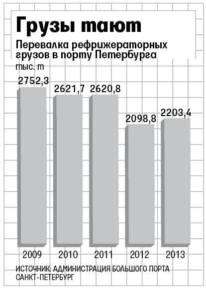 По данным администрации Большого порта Санкт-Петербург, перевалка рефрижераторных грузов в порту в 2013 г. составила 2,2 млн т (см. таблицу), за шесть месяцев 2014 г. стивидоры обработали 1 млн т, на 5% меньше, чем за аналогичный период прошлого года.