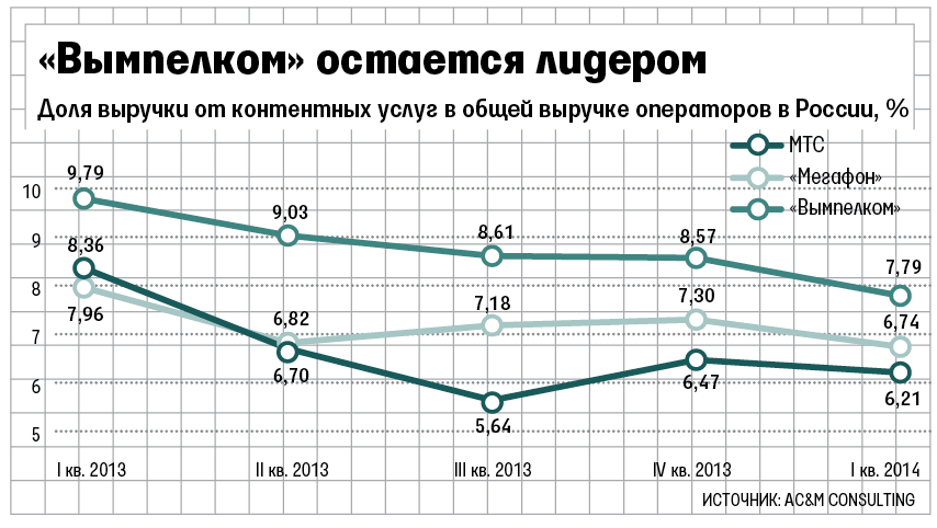 Выручка российских сотовых операторов от контент-услуг в I квартале 2014 г. сократилась почти на 17% по сравнению с тем же периодом 2013 г.: с 16 млрд до 13,3 млрд руб., а по сравнению с предыдущим кварталом снижение составило 12,7%, подсчитало агентство AC&M-Consulting. По словам аналитика AC&M-Consulting Оксаны Панкратовой, за первые три месяца года выручка от брендированных контент-услуг операторов сократилась на 10%, а контент-провайдеры потеряли около 15% выручки. По итогам II квартала 2014 г. операторов ждет рекордное снижение доходов от контент-услуг - минимум на 25%, прогнозирует она. Операторы, по ее прогнозу, потеряют от 10 до 15%, а вот выручка от услуг контент-провайдеров может сократиться на 40-50%.