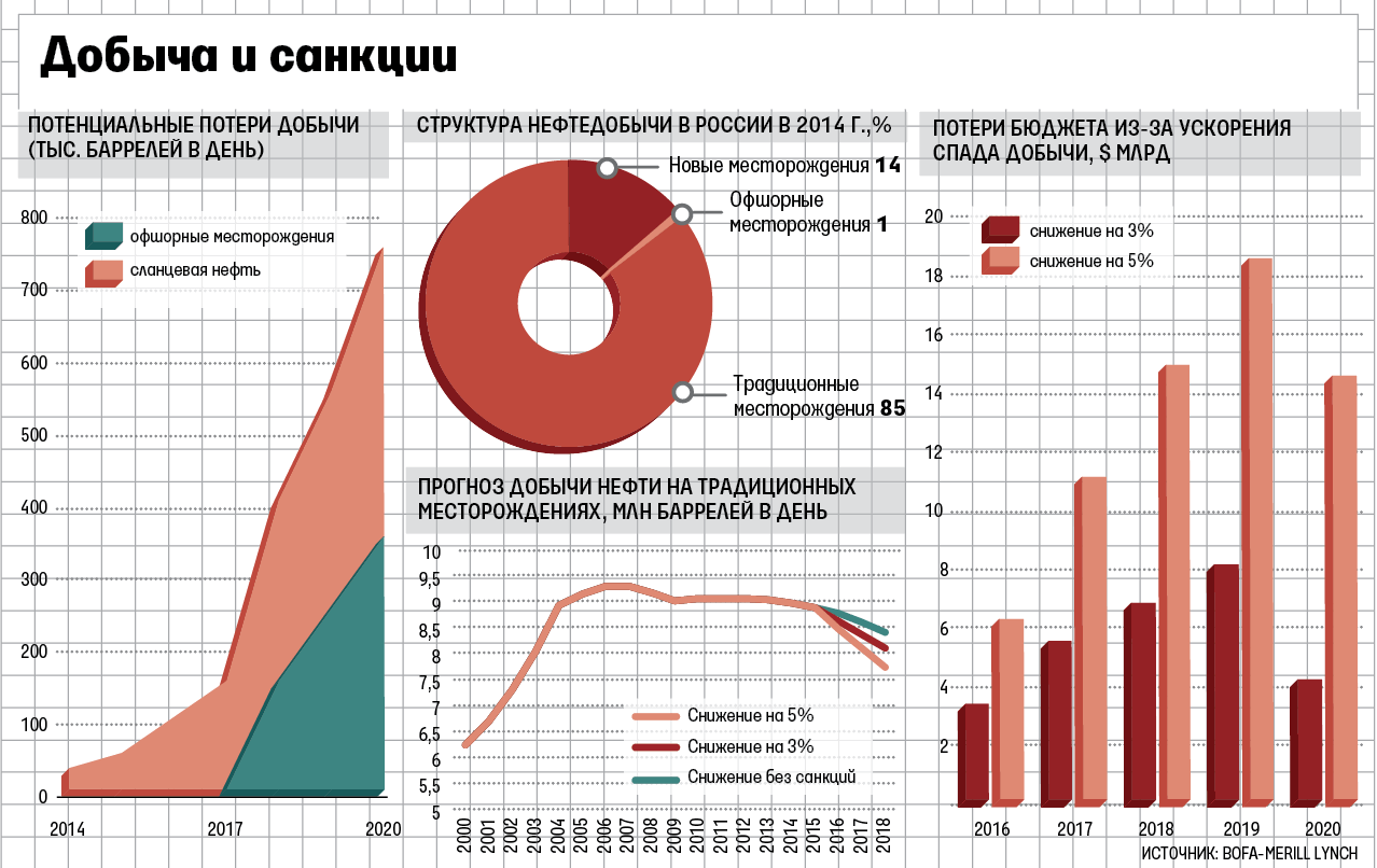 Санкции против российских нефтяных компаний дорого обойдутся российскому бюджету из-за падения добычи сырья: отрасль не справится без технологий, прогнозирует Bank of America Merrill Lynch