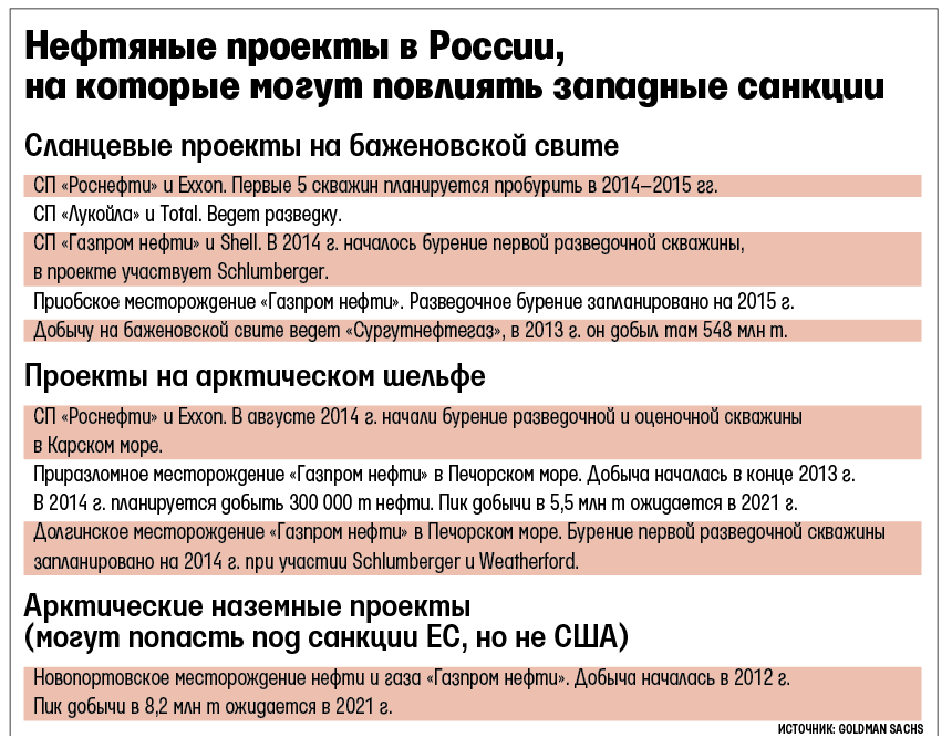 Из-за санкций США и ЕС в ближайшее время под угрозой могут оказаться два месторождения «Газпром нефти» - Приразломное и Новопортовское, считают аналитики Goldman Sachs. Санкции ограничивают экспорт оборудования для глубоководного бурения, добычи сланцевой нефти и разработки арктических месторождений. Во всей России из действующих месторождений только Приразломное и Новопортовское уже нуждаются в западных технологиях, пишут они.
