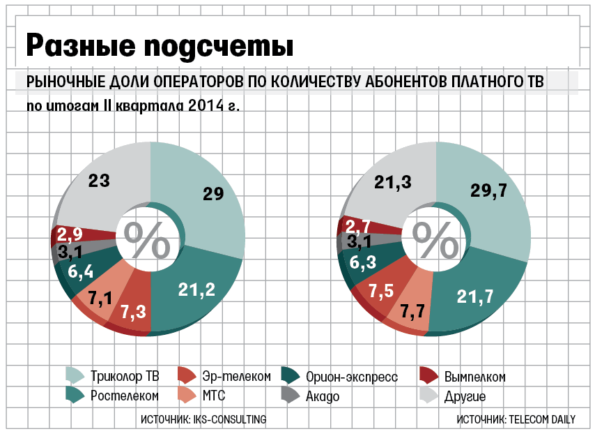 Данные iKS-Consulting и Telecom Daily по ТВ операторам, занимающим 1-е и 2-е места, - «Триколор ТВ» и «Ростелекому» - сходятся: на конец первого полугодия 2014 г. они обслуживали 10,56 млн и 7,7 млн абонентов. По словам Макаревич, аналитические агентства часть данных обычно получают от компаний, а часть оценивают сами.