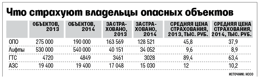 Принятый в марте прошлого года закон о безопасности опасных объектов обязал их собственников до 1 января 2014 г. перерегистрировать их в реестре Ростехнадзора. Согласно презентации Национального союза страховщиков ответственности (НССО; есть у «Ведомостей»), за 2014 г. число опасных объектов в стране сократилось с 275 000 до 190 000.