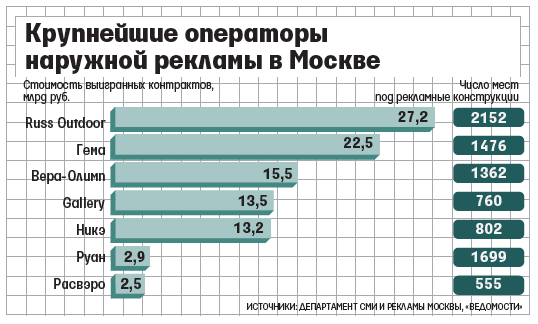 За последние два года практически все места под рекламу в столице были заново разыграны на торгах. Необходимость передела рынка появилась в 2013 г., когда истекли контракты на 90% поверхностей в стране. В это время уже действовала новая версия закона «О рекламе», по которой места могут передаваться компаниям только через торги. Прежде город, как правило, автоматически продлевал договоры с операторами.