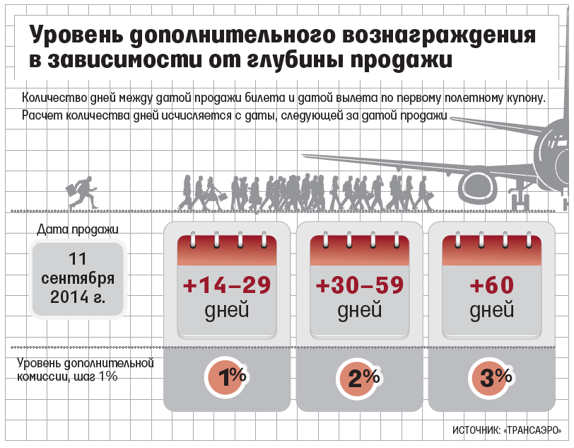 С сегодняшнего дня «Трансаэро» ввела дополнительное вознаграждение для агентов, продающих ее билеты, следует из письма, которое авиакомпания разослала вчера партнерам (копия есть у «Ведомостей»). Дополнительную комиссию агентства будут получать от «Трансаэро» за глубину продаж: чем позже с момента продажи выполняется рейс, тем выше комиссия (см. таблицу). Самая высокая - 3% - за продажи на рейсы с датой вылета от 60 дней. Это правило будет действовать «до особого распоряжения», говорится в письме «Трансаэро».