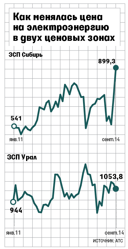 Цены на электроэнергию в Сибири бьют исторические рекорды, следует из данных «Администратора торговой системы» (АТС, организует торги на рынке на сутки вперед (РСВ), где торгуется электроэнергия, одна из составляющих счета за свет). За август цена выросла на 27,4% до 727,17 руб./МВт ч, а в сентябре - еще на 22,2% до 923,13 руб./МВт ч, говорится на сайте компании. Это на 32 и 44% выше, чем за аналогичные периоды прошлого года. Кроме того, в сентябре цена шесть раз обновила исторический максимум, 3 сентября поднявшись до 933,8 руб./МВт ч, а 15 сентября - до 1063,6 руб./МВт ч, рассказывает представитель НП «Совет рынка» (регулятор рынка). Исторически цены во второй ценовой зоне (Сибирь) примерно на 35% ниже, чем в первой (Европа и Урал), но за август и сентябрь эта разница сократилась до 22%, подсчитала главный эксперт Центра экономического прогнозирования Газпромбанка Наталья Порохова.