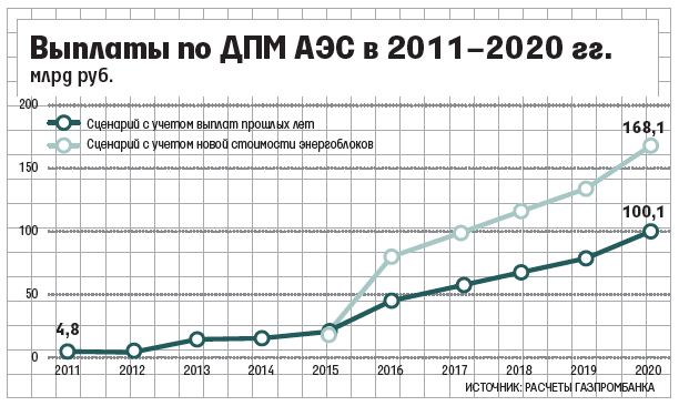 До 2020 г. в России должно быть введено 9,7 ГВт атомной мощности по ДПМ. Их стоимость оплачивается всеми потребителями, кроме населения и потребителей Северного Кавказа. Если ФСТ утвердит заявки «Росэнергоатома», третий энергоблок Белоярской АЭС обойдется рынку в 35 млрд руб. в год уже в 2016 г., или в 1,8% к конечной цене электроэнергии, подсчитала главный эксперт Центра энергетического прогнозирования Газпромбанка Наталья Порохова. Стоимость новой атомной мощности исходя из новых заявок «Росэнергоатома» к 2020 г. может вырасти со 100 млрд до 168 млрд руб., говорит она. У Минэкономразвития расчет скромнее, но порядок тот же, подтверждает чиновник министерства. Чтобы сгладить возрастающую нагрузку, министерство предлагает исключить из расчета доходности по атомным ДПМ целевые инвестиционные средства в 2016 г. с последующей компенсацией после 2017 г.