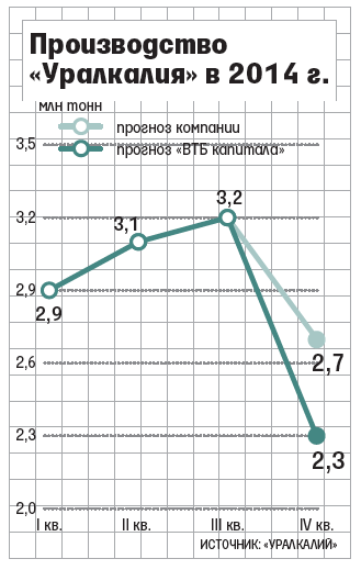 «Уралкалий» продолжает наращивать производство. Компания может превысить годовой план в 11,5 млн т калия, считают аналитикиСкорее всего компания превысит план и по итогам года произведет от 11,7 млн до 12 млн т, считает аналитик Газпромбанка Дарья Снитко. Этот показатель близок к первоначальному плану компании на этот год (12 млн т). С начала 2014 г. он был скорректирован до 11 млн т, а затем - до 11,5 млн т. Чтобы удержать плановый прогноз, в IV квартале компании придется сократить загрузку мощностей со 100 до 70%, подсчитал Юминов. Представитель «Уралкалия» не комментирует возможный пересмотр прогноза.