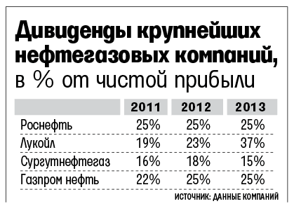 В августе «Лукойл» отчитался о выплате дивидендов за 2013 г. - те же 60 руб. на акцию, всего 51 млрд руб. Дивиденды растут с 1997 г. В 2011 г. «Лукойл» выплатил акционерам 75 руб. на акцию, затем стал выплачивать дивиденды дважды в год. В 2012 г. они суммарно составили 90 руб. на акцию, в 2013 г. - 110 руб., или 36,5% от чистой прибыли, это самая высокая доля среди крупнейших российских нефтегазовых компаний (см. таблицу). В конце августа вице-президент «Лукойла» Леонид Федун говорил, что планируется продолжать увеличивать дивиденды.