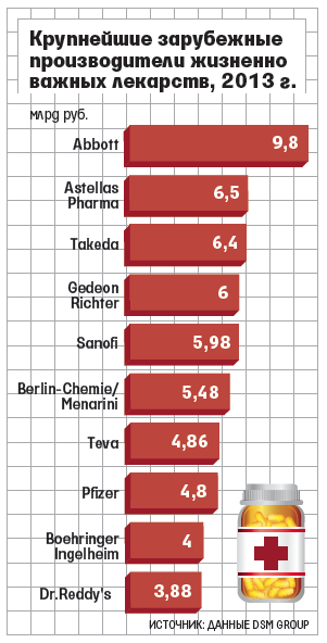 На жизненно важные лекарства, по данным DSM Group, приходится 34,3% коммерческого сегмента фармацевтического рынка (т. е. продажи лекарств в аптеках, его оборот в 2013 г. - 609 млрд руб.), из них импорт - это 77,5% в деньгах. Цены на препараты из списка регулирует государство: Минздрав по согласованию с Федеральной службой по тарифам (ФСТ) регистрирует предельные отпускные цены производителя, регионы устанавливают оптовые и розничные надбавки. Иностранные производители регистрировали цены, исходя из средневзвешенной цены ввоза препарата за второе полугодие 2009 г. и цен в 21 референтной стране. В 2010 г. цены были перерегистрированы в рублях. С тех пор они не пересматривались - действующая методика установления цен на жизненно важные лекарства не позволяет иностранным производителям это делать.