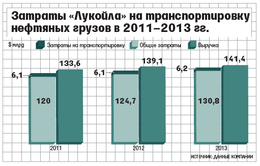 «Лукойл» 70% нефтепродуктов перевозит железнодорожным транспортом, остальное - трубопроводным и водным, нефть компания транспортирует в основном по трубе, говорится в материалах нефтяной компании. Затраты «Лукойла» на перевозку нефти и нефтепродуктов в 2013 г. составили 4,7% от общих затрат (см. график). «Лукойл» - не единственная нефтяная компания, которая обеспокоена тарифами монополий. Президент «Роснефти» Игорь Сечин писал президенту Владимиру Путину, что рост тарифа на прокачку нефти в восточном направлении (тариф для ВСТО предлагается увеличить на уровень прогнозной инфляции) «необоснован». «Роснефть» транспортирует по трубе 94,5% экспортной нефти.