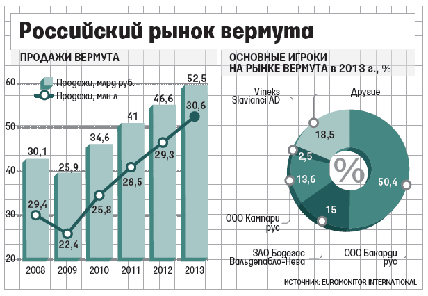 Сейчас категория вермутов чувствует себя стабильно, отмечает представитель Metro Cash & Carry Оксана Токарева. По ее словам, лидер рынка по-прежнему Martini. Падают ли продажи этой марки в России, не известно: компания Bacardi (ей принадлежит Martini) таких данных не публикует. Roust (владеет и импортирует в Россию вермут Gancia) по итогам 2014 г. ожидает роста продаж в категории более чем на 20%.