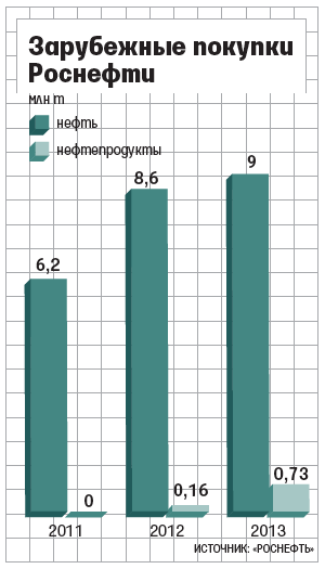 «Роснефть» покупает нефть на международном рынке для поставок на немецкие заводы Ruhr Oel GmbH, а нефтепродукты - для продажи на территории Германии, говорится в анализе руководством финансового состояния и результатов деятельности компании (см. график). Закупка нефти за рубежом ей обходится дороже, чем в России. Согласно отчету за 2013 г. покупка 1 т нефти на внутреннем рынке обходилась «Роснефти» в сумму около 10 300 руб., а на международном - в 25 900 руб. Топливо за рубежом она покупала по 29 700 руб. за 1 т, а, например, высокооктановый бензин в России - по 29 900 руб., дизтопливо - по 26 800 руб. за 1 т.