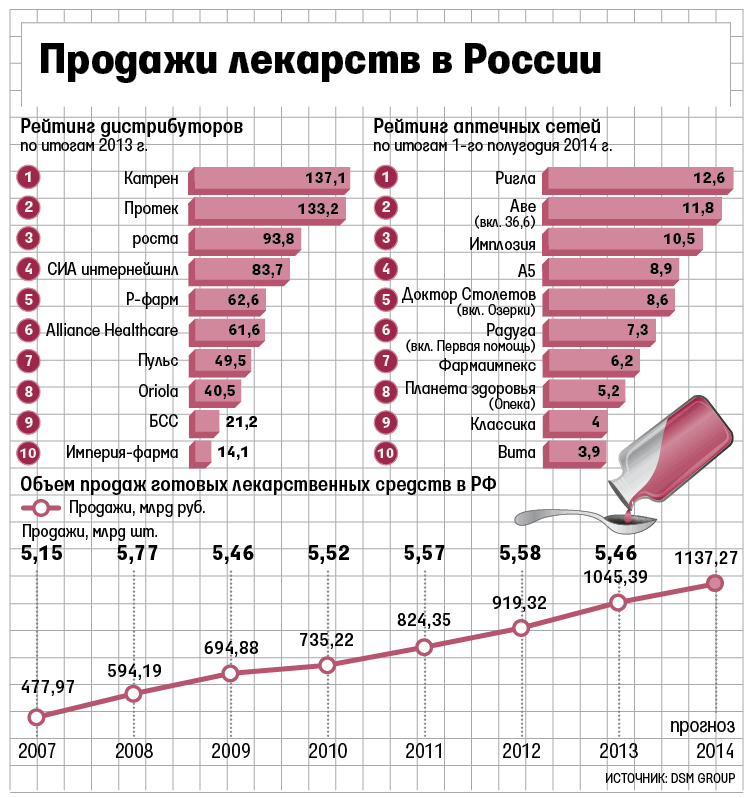 Основные игроки (это 4-5 компаний) продолжат укрупняться благодаря уходу маленьких дистрибуторов, конкуренция будет усиливаться, сказал Преображенский. По его прогнозу, темпы роста продаж будут снижаться, доходность дистрибуции постепенно упадет до уровня, сравнимого с уровнем доходности западных дистрибуторов. Это рентабельность по чистой прибыли в 0,5-1%, говорит Шуляк. Развитие рынка дистрибуции в 2014-2015 гг. будет существенно опережать инфляцию, поскольку 70% рынка в деньгах - это импортные медикаменты, объясняет Конобеев.