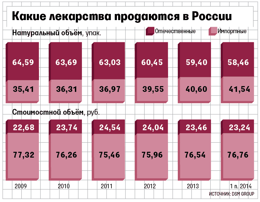 - В 2009 г. [у российских компаний] было 22%, в 2013 г. - 26% (см. табл., данные аналитических агентств не всегда совпадают. - «Ведомости»). Производство лекарств в стране за последние пять лет выросло вдвое. Если бы мы не сделали те шаги, которые сделали в 2009-2010 гг., то, скорее всего, доля российского производителя на рынке была бы меньше 15%. К тому же фармацевтика, как любой высокотехнологичный сегмент, не показывает быстрых результатов.