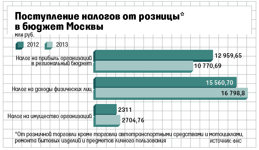 Сами розничные сети утверждают обратное. По расчетам Ассоциации компаний розничной торговли (АКОРТ), только 15 крупных ритейлеров в 2013 г. заплатили в московский бюджет 26,5 млрд руб. Данные включают в себя показатели X5 Retail Group, «Дикси», «Ашана», «М.видео» и др. по налогу на прибыль, НДФЛ и налогу на имущество. Например, «М.видео» заплатила в бюджет Москвы в 2013 г. 494 млн руб. налога на прибыль, 384 млн руб. НДФЛ и налог на имущество 143 млн руб., всего - свыше 1 млрд руб., заявил представитель ритейлера. По данным Федеральной налоговой службы, за прошлый год в московский бюджет от розницы поступило более 30 млрд руб. (см. таблицу).