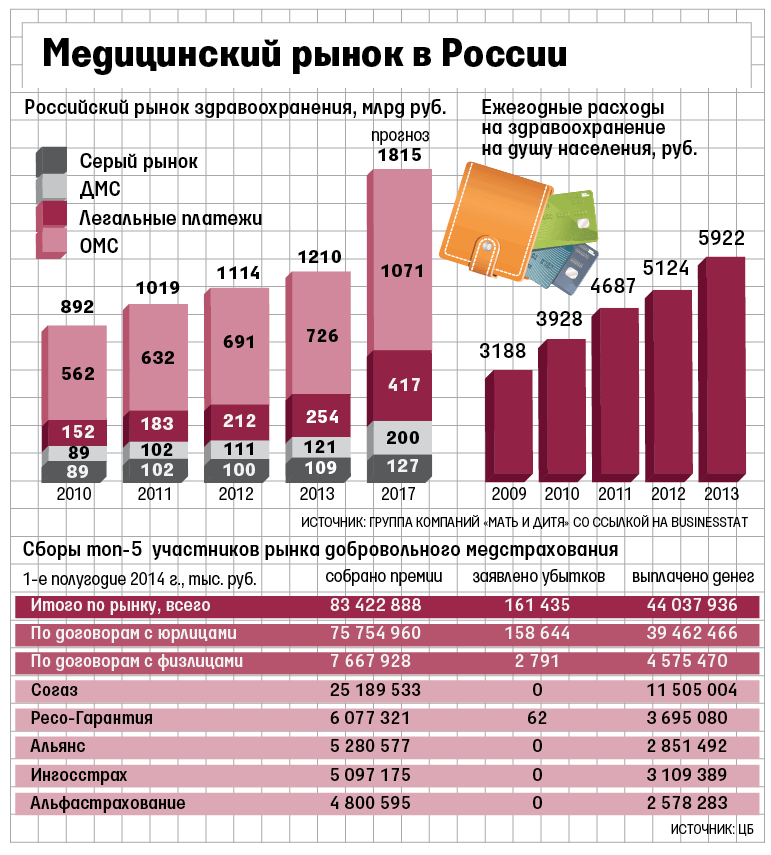 В последние годы рынок добровольного медицинского страхования (ДМС) растет за счет увеличения численности застрахованных, числа компаний, страхующих своих сотрудников, и медицинской инфляции, говорит директор департамента андеррайтинга и методологии ДМС «Альфастрахования» Александр Лапунов. В первом полугодии 2014 г. рынок прибавил 10,3%, по итогам года он вырастет на 12%, считает директор департамента по сопровождению ДМС «Либерти страхования» Игорь Степин. Рынок вырастет лишь на 5-7% до 120-122 млрд руб., в 2015 г. - до 130 млрд руб., полагает вице-президент «Метлайфа» Александр Лазарев.