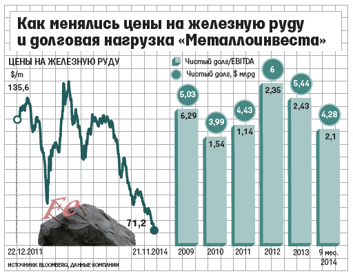 Кризис на рынке металлургического сырья заставляет «Металлоинвест» искать новые рынки сбыта. Но компании благодаря акциям «Норникеля» удается копить на выплату долговС начала года цены на железную руду снизились на 46% до $71 за 1 т и продолжают падать (см. график). И даже «Металлоинвест» - один из самых низкозатратных производителей этого вида сырья в мире (сумму затрат на тонну продукции компания не раскрывает) - не в лучшей форме. Выручка «Металлоинвеста» в III квартале в сравнении с предыдущим упала на 9,1% до $1,5 млрд, EBITDA - на 19,1% до $415 млн, рентабельность по этому показателю составила 26,4%. Чистая прибыль рухнула на 86,4% до $59 млн. Падение прибыли компания объясняет курсовыми разницами из-за переоценки долларовой части долга, которая составляет 53%.
