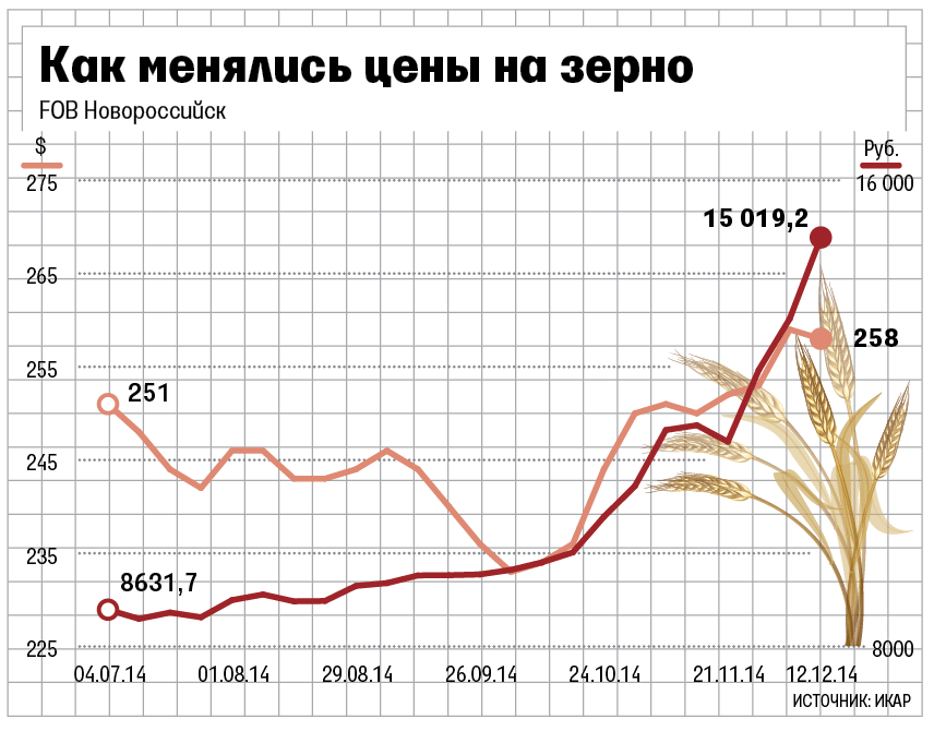 Даже после повышения государственные цены остаются ниже рыночных во всех зерноизбыточных регионах, говорит гендиректор ИКАР Дмитрий Рылько. Закупить по ним зерно будет крайне затруднительно, полагает он. Вчера утром тонна зерна на FOB Новороссийск (способ поставки зерна) продавалась по $257 (14 996 руб. по курсу ЦБ на 16 декабря). Хозяйствам гораздо выгоднее продать его мукомолам и производителям комбикорма, уверен Рылько: они платят 11 000-12 500 руб. за тонну зерна 3-го класса. Никакого эффекта от повышения интервенционных цен не будет, соглашается зерновой трейдер. К тому же большую часть зерна уже вывезли - около 20 млн т при экспортном потенциале на этот год на уровне 31-32 млн т. Остальное же, по словам собеседника «Ведомостей», трейдеры стремятся продать как можно скорее из-за слухов о возможном ограничении экспорта. «Лучше бы Минсельхоз четко пообещал, что по достижении определенного порога экспорта введет пошлины, и не держал рынок в неизвестности», - рассуждает он. К тому же, по словам сотрудника зерновой компании, возможностей для активной отгрузки зерна за границу осталось немного: в 2015 г. экспортные поставки могут возобновиться только в середине января, а азовские и таманский порты зимой замерзают.