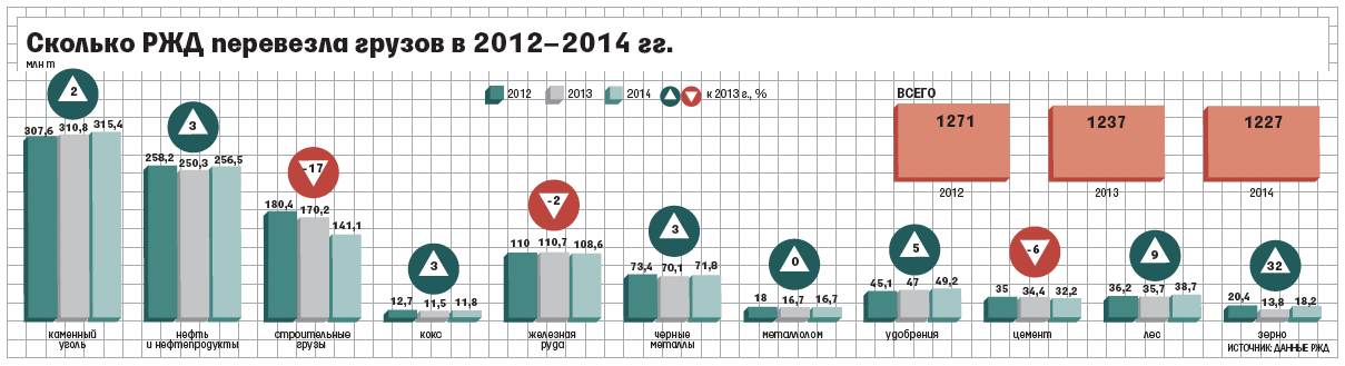 Падение погрузки связано с общей экономической ситуацией и переключением грузов на автотранспорт, говорится в обзоре «ВТБ капитала». Представитель РЖД связывает падение погрузки с сокращением перевозок строительных грузов - на 17,1% до 141,1 млн т - из-за окончания строительства олимпийских объектов. Грузооборот РЖД в 2014 г. вырос на 4,6% до 2,29 млрд тонно-километров. Аналитики «ВТБ капитала» объясняют это ростом перевозок угля на экспорт через порты Дальнего Востока.
