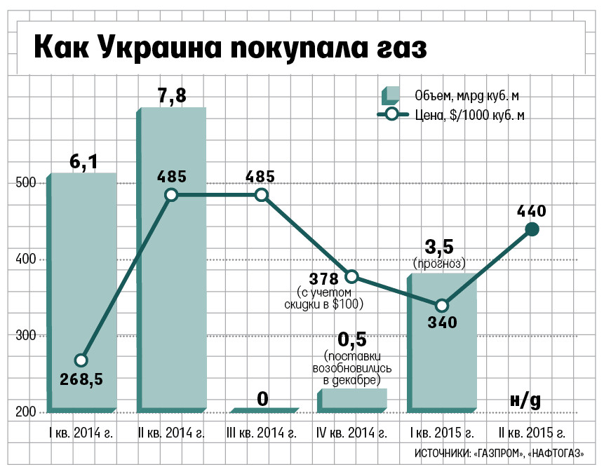 В IV квартале цена газа для Украины с учетом скидки и снижения цен на нефть (к ним привязана цена на газ) уменьшилась с $485 до $378 за 1000 куб. м. В I квартале 2015 г. она составит $340-360, говорил в декабре министр энергетики России Александр Новак. То есть с апреля цена может возрасти до $440-460.