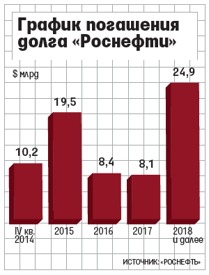 «Роснефть» просит деньги не на конкретные проекты, а на выплату долга - поэтому и растет заявка, считают несколько чиновников. Только в феврале госкомпания должна выплатить $7,1 млрд, следует из квартального отчета по РСБУ; за весь 2015 год - $19,5 млрд, согласно презентации компании (см. график).