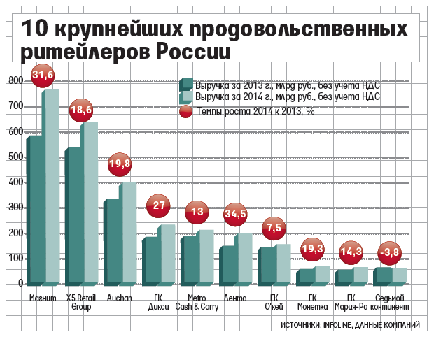 В 2014 г. «Дикси», принадлежащей совладельцам крупнейшего дистрибутора сигарет в России «Мегаполис» Игорю Кесаеву и Сергею Кациеву, впервые удалось обогнать по выручке германскую Metro Cash & Carry, следует из данных Infoline. «Дикси» в последние годы занимала пятую строчку в рейтинге крупнейших российских продавцов продовольствия, но по итогам 2014 г. она уже на 4-м месте и уступает только лидерам рынка - «Магниту», X5 Retail Group (сети «Пятерочка», «Перекресток» и «Карусель») и «Ашану» (см. график).