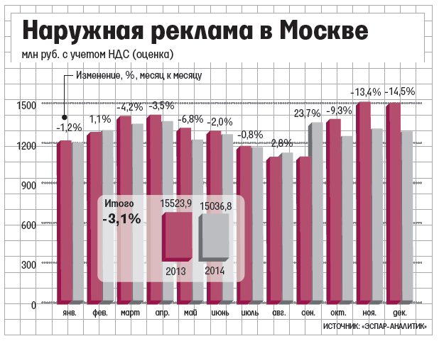 В прошлом году компании потратили на наружную рекламу в столице 15 млрд руб., что на 3,1% меньше, чем годом ранее, подсчитала аналитическая компания «Эспар-аналитик». Объемы размещения падали весь прошлый год, за исключением трех месяцев - февраля, августа и сентября. Самое большое падение было зафиксировано в конце года: в декабре рынок потерял сразу 14,5%.