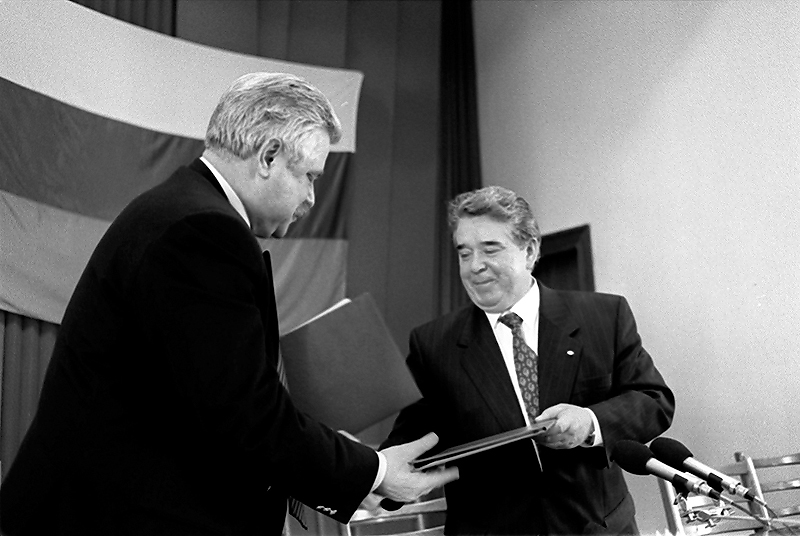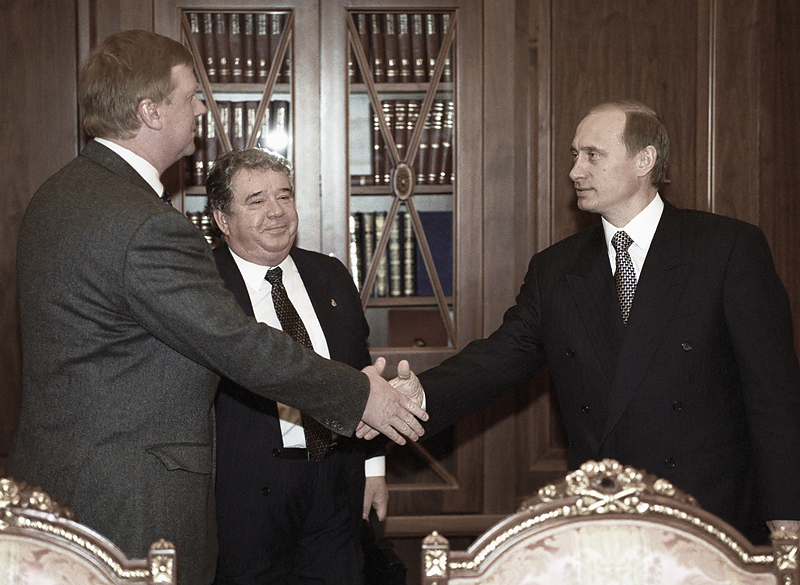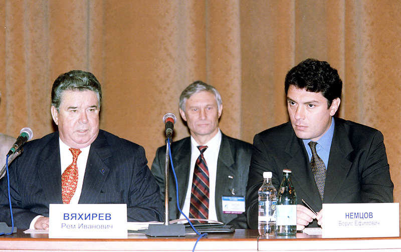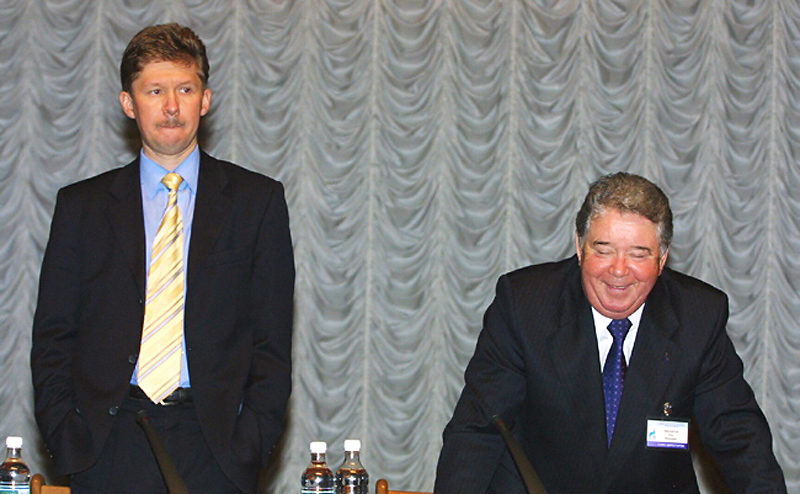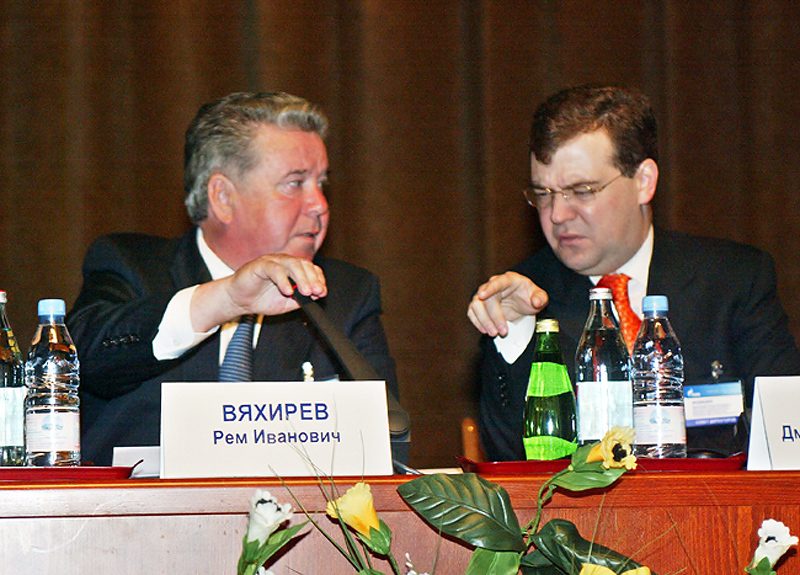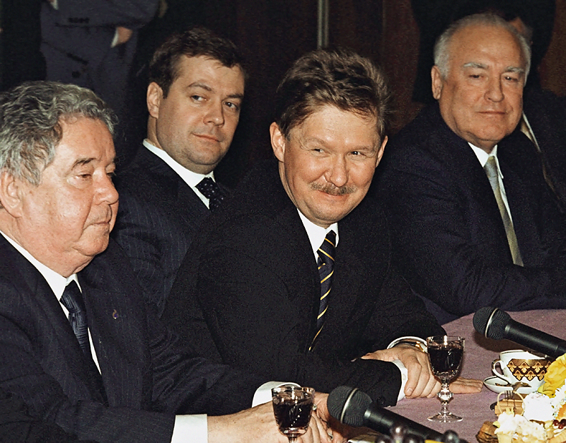 Ветераны и руководители "Газпрома" на вечере, посвященном 10-летию компании. Слева направо: бывший глава "Газпрома" Рем Вяхирев, председатель правления "Газпрома" Алексей Миллер, председатель совета директоров компании Дмитрий Медведев, ветеран газовой промышленности Виктор Черномырдин. 2003 г.
