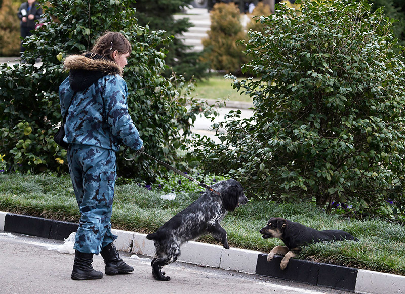Офицер полиции и служебная собака патрулируют улицы Сочи