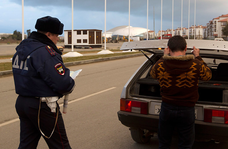 Сотрудник ДПС проверяет машину на дороге в Сочи