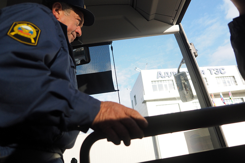 Охранник проверяет автобус на въезде на Адлерскую ТЭС