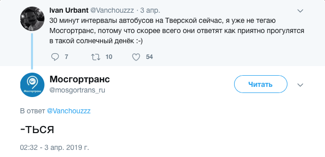 3 апреля один из клиентов написал в Twitter: «30 минут интервалы автобусов на Тверской сейчас, я уже не тегаю Мосгортранс, потому что скорее всего они ответят как приятно прогулятся в такой солнечный денек» (орфография и пунктуация автора сохранены). На это «Мосгортранс» ответил: «Ться», указывая на содержащуюся в сообщении клиента орфографическую ошибку. Под сообщением пользователя развернулась дискуссия, на ответ также обратили внимание московские и подмосковные СМИ, в частности «Москва 24», «Телеканал 360».