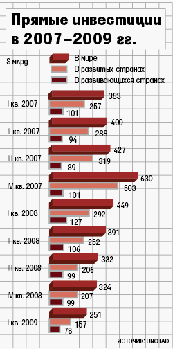 Кризис изменил инвестиционный ландшафт. Доля переходных и развивающихся экономик в общем потоке капитала в 2008 г. выросла на 17% до 43% ($621 млрд), отмечают эксперты UNCTAD, развитых стран – упала на 29% до $962 млрд.